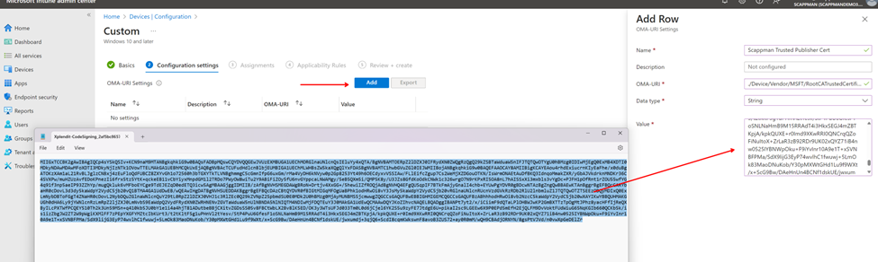 Construct OMA-URI: ./Device/Vendor/MSFT/RootCATrustedCertificates/TrustedPublisher/**!Placethumbprintnumberhere!**/EncodedCertificate